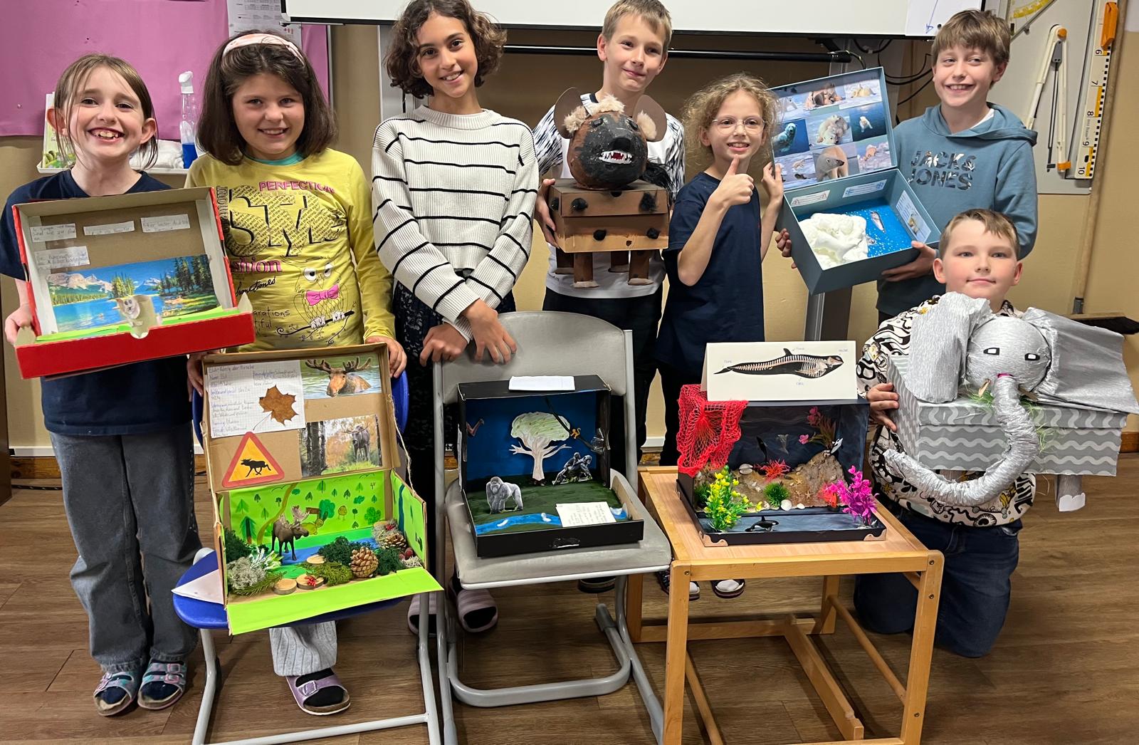 Die Schülerinnen und Schüler der Klasse 1a haben sich intensiv mit der Artenvielfalt der Säugetiere beschäftigt. In fantasievoller und gestalterischer Arbeit entstanden Dioramen aus Schuhkartons, die zu verschiedenen Tieren umgebaut wurden.
